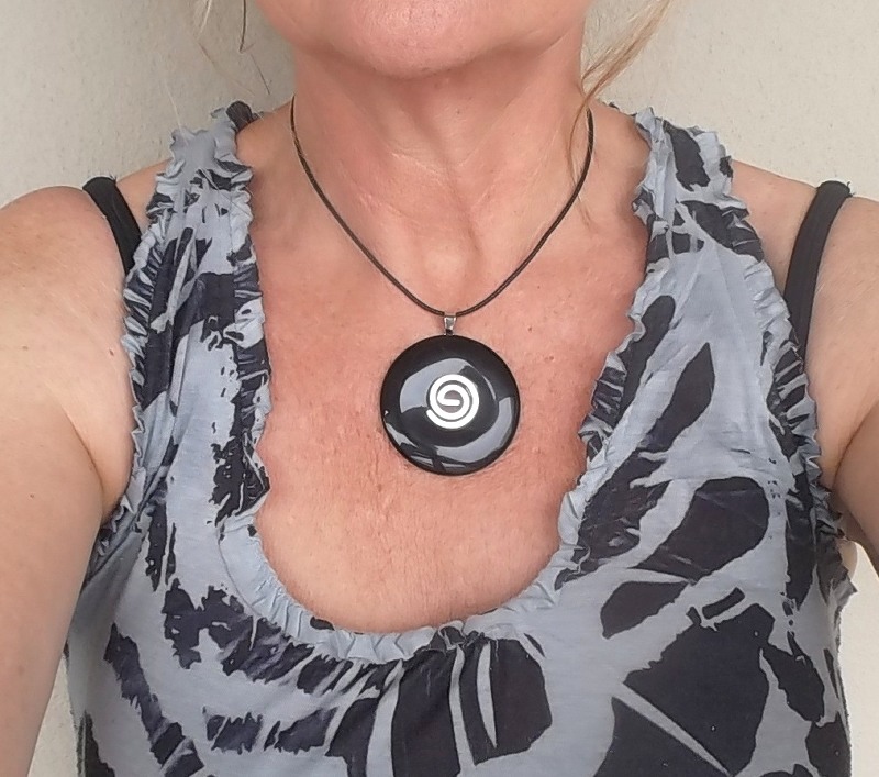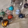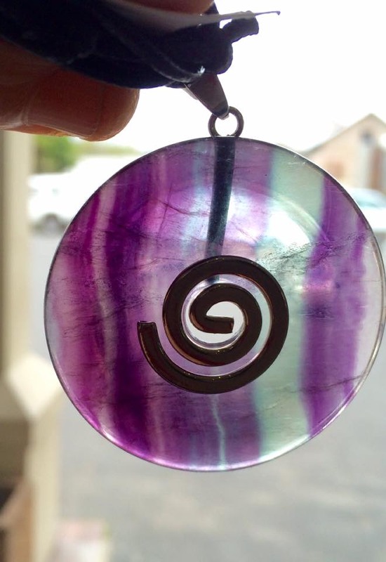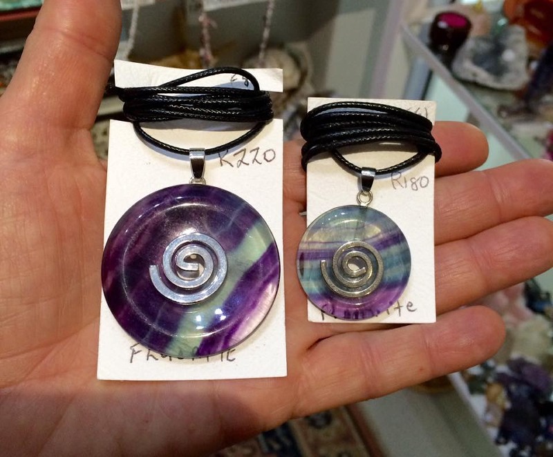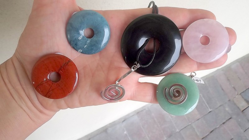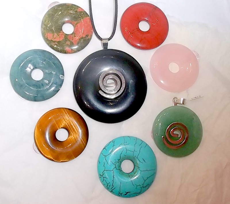 The large donut in the middle of the main picture is an onyx and also avail in the regular sizes pictured in the rest. Directly left of the Onyx is a Blue Jade, then to the right a Unakite, Jasper, Rose quartz, Aventurine, Turquenite, Tiger Eye. Carnelian, Lapis, labradorite, and Malachite also avail at times – ask for prices pse. The striped transparent stone in regular and large size is the Flourite seen with a spiral holder. The donuts alone are generally priced between R90 and R150. Made up they average R170. They can be made up in 2 ways: a thong can be looped around the donut with a silver colour or wooden bead to fix in place for an extra R15, or with the silver spiral holder attached with a thong R60 extra. This can be slipped on and off and exchanged between different donuts. There are also SA Jade, Obsidian, Kalahari Picture stone and fire agate donuts available but these are not shown in the photos.