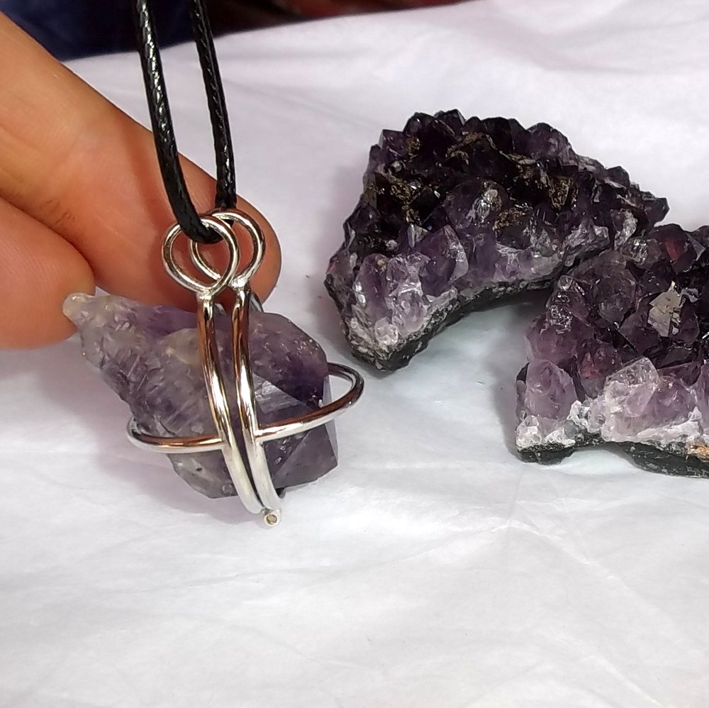 Amethyst rough crystal point in non sterling silver hinged cage pendant with amethyst crystals clusters also for sale – please contact me via email for cluster size and prices.