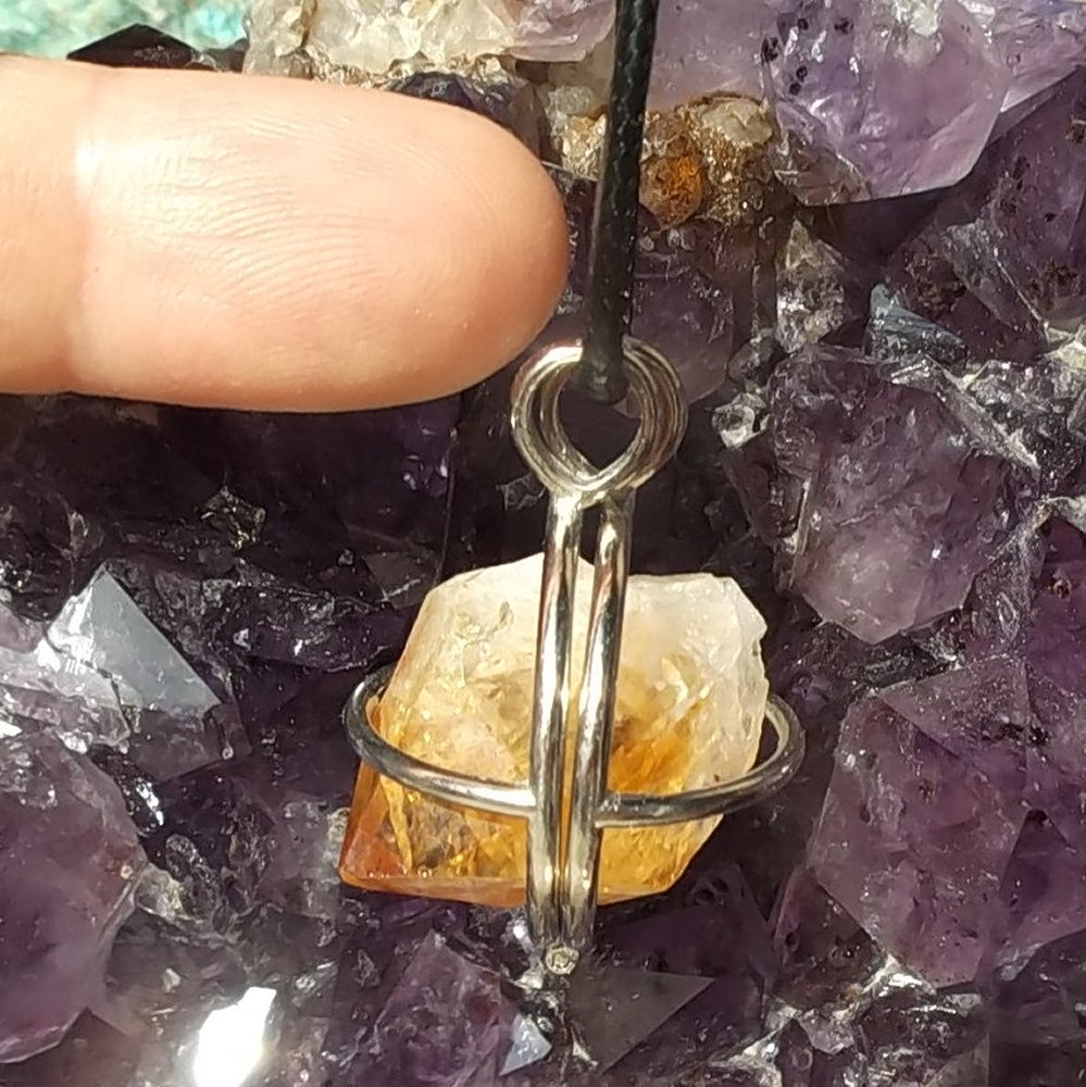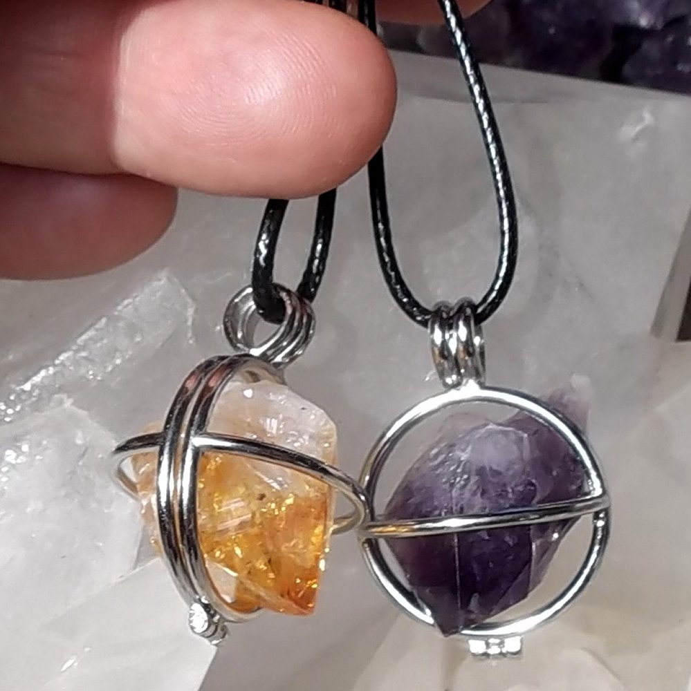 Citrine, Amethyst, Geode & Pyrite in non S. Silver hinged cages with adjustable thong.