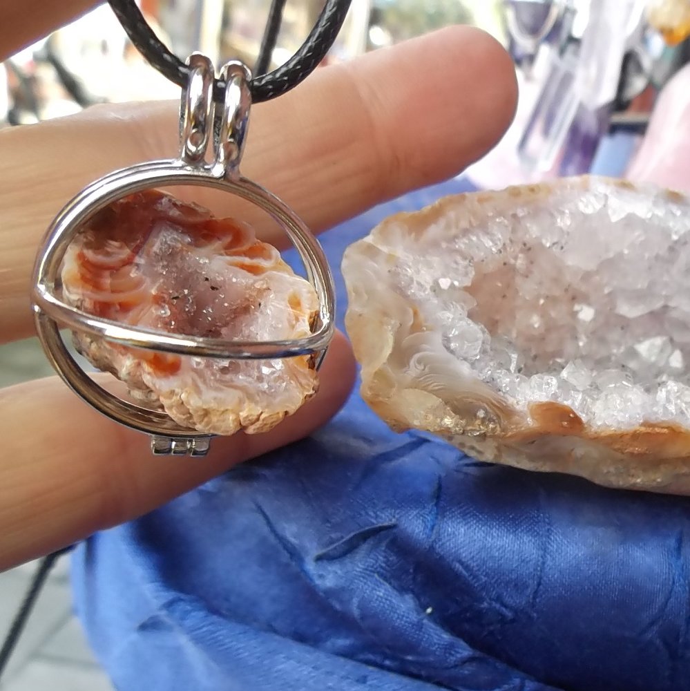 This style is also available with a citrine crystal, pyrite cubes, small agate geodes. Crystal/gemstone spheres or balls (30mm) are also on this site. All with adjustable black thong. If you decide to wear the fitting on your own silver chain and cut the thong, please note that the hinge will fall open with the smooth spheres so take care. It is not advisable to remove the rough stones and crystal as they are difficult to fit back in and you may break the hinge.